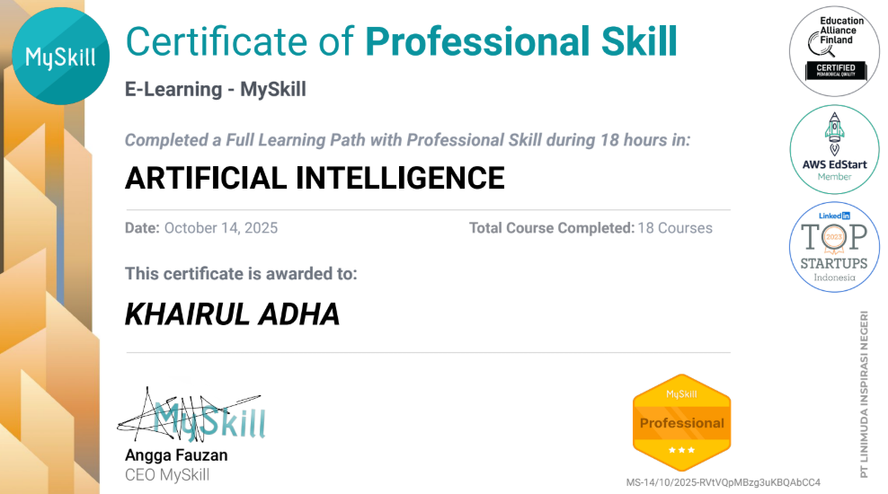 Udemy, YouTube, eBookMendalami pemrograman web (HTML, CSS, JavaScript), pengelolaan server (Apache, Nginx, Linux), serta konsep jaringan Mikrotik. Aktif membuat proyek-proyek kecil sebagai media latihan dan pembuktian kemampuan praktikal.