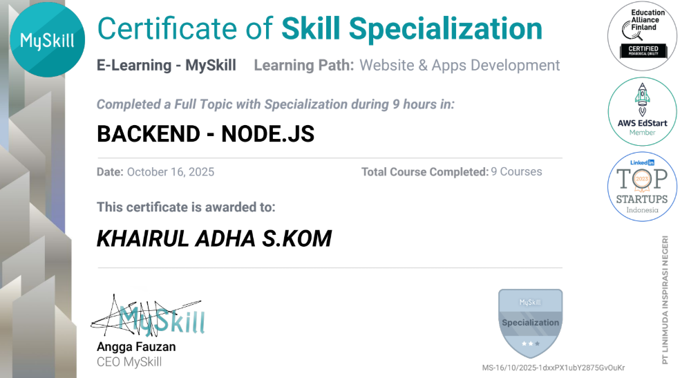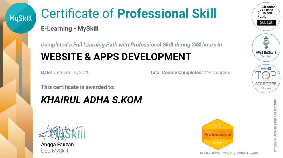 FreeCodeCamp & BuildWithAnggaMelalui bootcamp daring, memperdalam teknik full-stack development menggunakan Laravel, REST API, React JS, serta pengembangan dan deployment proyek skala UMKM dan instansi menggunakan standar industri.